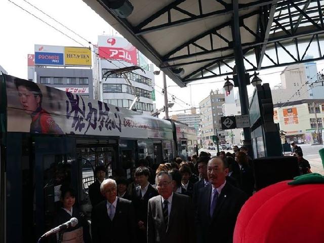 ラッピング電車出発式ではアンジュのユニフォームを着た運転士さんが横川駅から新チーム発表会の会場の近くまで連れて行ってくれました