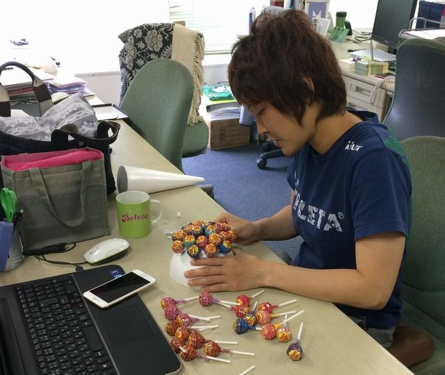 それならば、チュッパチャプスで花束を作ろう!となり、スタッフが制作に必要な材料を集めたのですが、いざ制作の段階に入ったところで、手伝いに名乗りをあげてくれたのが先輩の阪口選手でした。