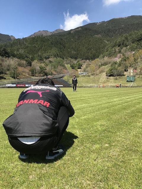 写真は、4月13日に行われたなでしこリーグカップの第2節、愛媛FCレディースさんのホームグラウンド、スカイフィールド富郷にて、試合前に岡本監督の撮影をしているみっきーさんです。