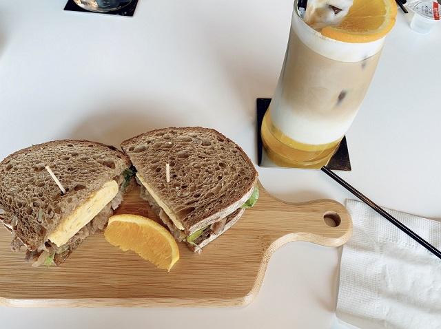 そこでプルコギ卵サンドとオレンジティーラテを頼みました!