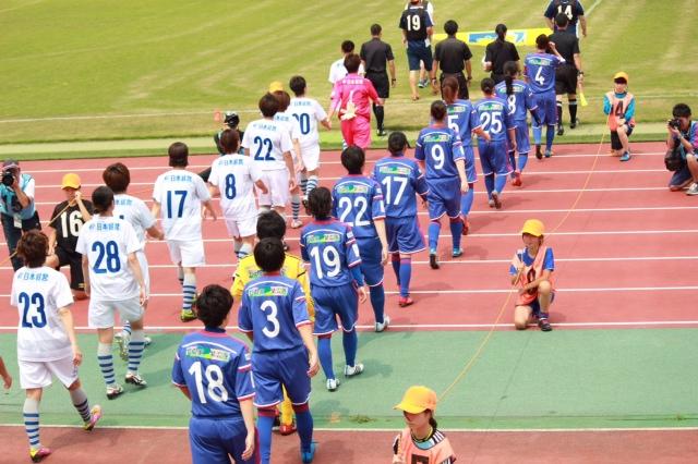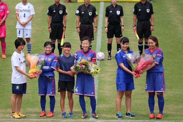 試合前には通算100試合達成、高橋さくら選手、坂口友紀選手、田中桜選手への花束贈呈が行われました。