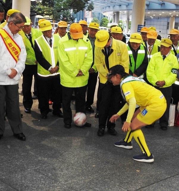 飲酒運転ゼロキャンペーンでは、お酒に酔った感覚を体験できる特殊なメガネをかけてパスやリフティングに挑戦しました。