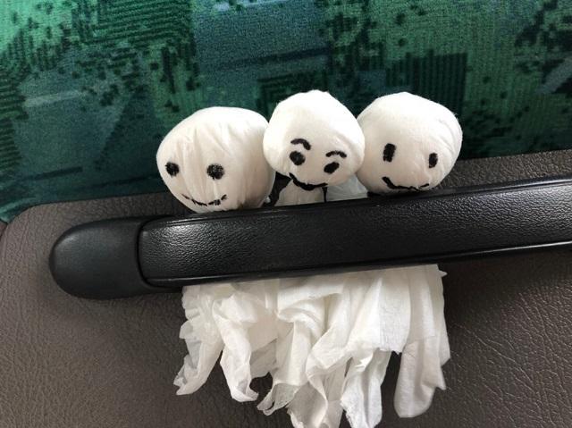 (前日のバス移動の中、取手にかけられるてるてる坊主たち)