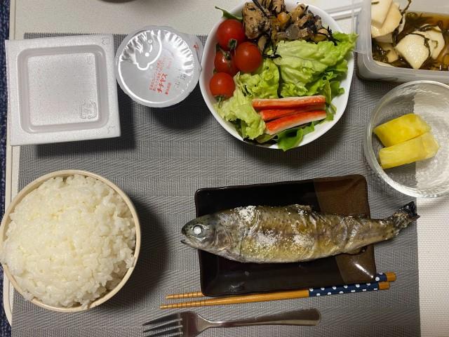 日本昔話のような山盛りの白ごはん、塩を振りすぎたニジマス、つまみ食いしたらいつのまにか減っていたパイナップル、ひじきばっかりつまみ食いして他の具が残ったひじきサラダ、早く食べたくてお皿に移されることなくタッパーで登場した山芋ちゃんと納豆のネバネバコンビ、ヨーグルト!