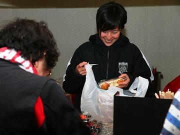 さて、そんな中、浦和駒場スタジアムで行われたホームゲーム2試合に、選手プロデュースグルメの担当として、私の大好きなたこ焼きに、塩越選手のセンスで明太子とマヨネーズとこだわりのチーズでトッピングした、おいしい「めんたいマヨチーズたこ焼き」を販売いたしました。