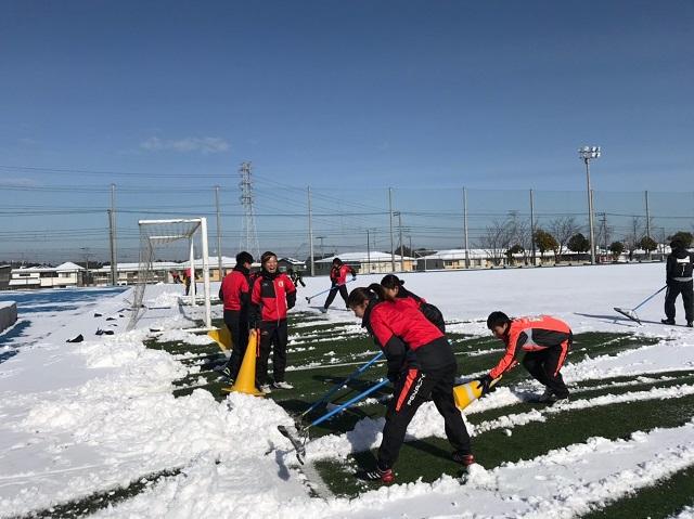 雪の中の練習試合から始まり、全員で雪かき。