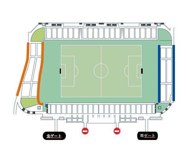 メインスタンド、両ゴール裏立見席(一部閉鎖エリアあり)