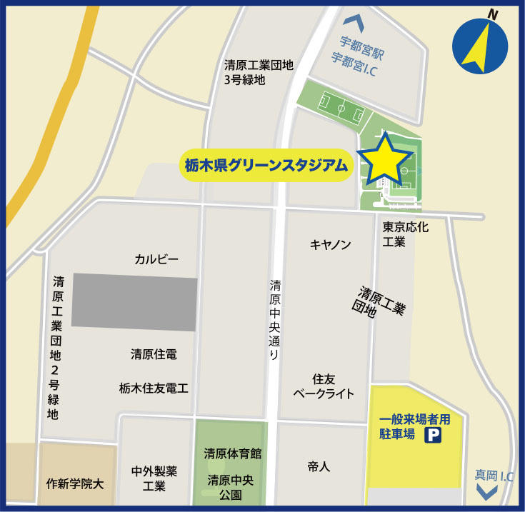 グリーンスタジアムでは、キヤノン様のご好意により、約2,000台分の駐車場があります。駐車場からスタジアムへは徒歩で10分ほどです。