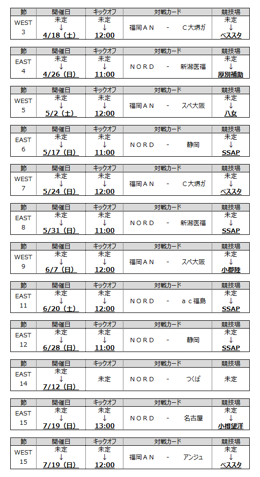 このページを共有する 2020年02月21日 開催日、キックオフ時刻、スタジアム決定のお知らせ【2020プレナスなでしこチャレンジリーグ】 2020プレナスなでしこチャレンジリーグの開催日、キックオフ時刻、スタジアムが下記の通り決定となりましたので、お知らせいたします。※太字下線が決定部分です このページを共有する 前へ 一覧へ 次へ 最新記事2025年12月15日チーム試合レポート:皇后杯準決勝 伊賀FCくノ一三重 vs INAC神戸レオネッサ2025年12月10日リーグ2026シーズンチーム編成および開幕日・大会期間決定のお知らせ2025年12月08日チーム試合レポート:皇后杯準々決勝 伊賀FCくノ一三重 vs 日体大SMG横浜2025年12月08日チーム試合レポート:皇后杯準々決勝 セレッソ大阪ヤンマーレディース vs 朝日インテック・ラブリッジ名古屋2025年12月08日チーム試合レポート:皇后杯準々決勝 サンフレッチェ広島レジーナ vs ASハリマアルビオン2025年11月25日チーム試合レポート:皇后杯3回戦 三菱重工浦和レッズレディース vs 伊賀FCくノ一三重2025年11月25日チーム試合レポート:皇后杯3回戦 AC長野パルセイロ・レディース vs 朝日インテック・ラブリッジ名古屋2025年11月25日チーム試合レポート:皇后杯3回戦 ASハリマアルビオン vs JFAアカデミー福島2025年11月25日チーム試合レポート:皇后杯3回戦 INAC神戸レオネッサ vs 静岡SSUボニータ2025年11月25日チーム試合レポート:皇后杯3回戦 日体大SMG横浜 vs ディオッサ出雲FC