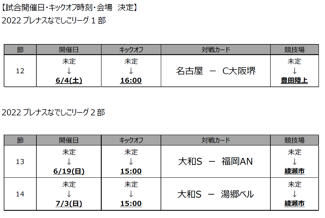 このページを共有する 2022年03月25日 2022 プレナスなでしこリーグ 1 部 2022 プレナスなでしこリーグ 2 部 日程追加決定のお知らせ 2022 プレナスなでしこリーグ 1 部、2022 プレナスなでしこリーグ 2 部の日程の未定分が追加決定いたしましたので、 下記の通りお知らせいたします。 このページを共有する 前へ 一覧へ 次へ 最新記事2025年12月10日リーグ2026シーズンチーム編成および開幕日・大会期間決定のお知らせ2025年12月08日チーム試合レポート:皇后杯準々決勝 伊賀FCくノ一三重 vs 日体大SMG横浜2025年12月08日チーム試合レポート:皇后杯準々決勝 セレッソ大阪ヤンマーレディース vs 朝日インテック・ラブリッジ名古屋2025年12月08日チーム試合レポート:皇后杯準々決勝 サンフレッチェ広島レジーナ vs ASハリマアルビオン2025年11月25日チーム試合レポート:皇后杯3回戦 三菱重工浦和レッズレディース vs 伊賀FCくノ一三重2025年11月25日チーム試合レポート:皇后杯3回戦 AC長野パルセイロ・レディース vs 朝日インテック・ラブリッジ名古屋2025年11月25日チーム試合レポート:皇后杯3回戦 ASハリマアルビオン vs JFAアカデミー福島2025年11月25日チーム試合レポート:皇后杯3回戦 INAC神戸レオネッサ vs 静岡SSUボニータ2025年11月25日チーム試合レポート:皇后杯3回戦 日体大SMG横浜 vs ディオッサ出雲FC2025年11月20日チーム試合レポート:皇后杯2回戦 日テレ・東京ヴェルディベレーザ vs ニッパツ横浜FCシーガルズ