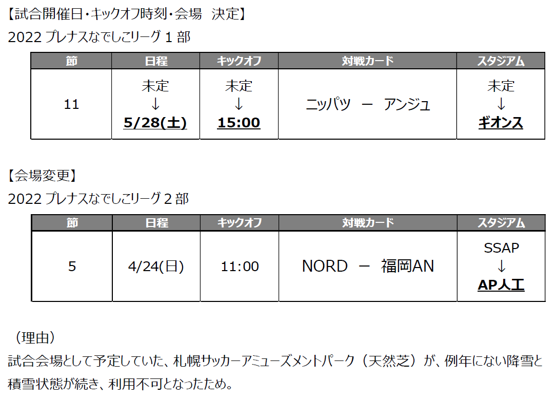 このページを共有する 2022年04月15日 2022プレナスなでしこリーグ1部 日程追加決定・2022プレナスなでしこリーグ2部 会場変更のお知らせ 2022プレナスなでしこリーグ1部の日程の未定分が追加決定、また2022プレナスなでしこリーグ2部の試合において会場変更が決定いたしましたので、下記の通りお知らせいたします。 詳細は、こちら このページを共有する 前へ 一覧へ 次へ 最新記事2025年12月15日チーム試合レポート:皇后杯準決勝 伊賀FCくノ一三重 vs INAC神戸レオネッサ2025年12月10日リーグ2026シーズンチーム編成および開幕日・大会期間決定のお知らせ2025年12月08日チーム試合レポート:皇后杯準々決勝 伊賀FCくノ一三重 vs 日体大SMG横浜2025年12月08日チーム試合レポート:皇后杯準々決勝 セレッソ大阪ヤンマーレディース vs 朝日インテック・ラブリッジ名古屋2025年12月08日チーム試合レポート:皇后杯準々決勝 サンフレッチェ広島レジーナ vs ASハリマアルビオン2025年11月25日チーム試合レポート:皇后杯3回戦 三菱重工浦和レッズレディース vs 伊賀FCくノ一三重2025年11月25日チーム試合レポート:皇后杯3回戦 AC長野パルセイロ・レディース vs 朝日インテック・ラブリッジ名古屋2025年11月25日チーム試合レポート:皇后杯3回戦 ASハリマアルビオン vs JFAアカデミー福島2025年11月25日チーム試合レポート:皇后杯3回戦 INAC神戸レオネッサ vs 静岡SSUボニータ2025年11月25日チーム試合レポート:皇后杯3回戦 日体大SMG横浜 vs ディオッサ出雲FC