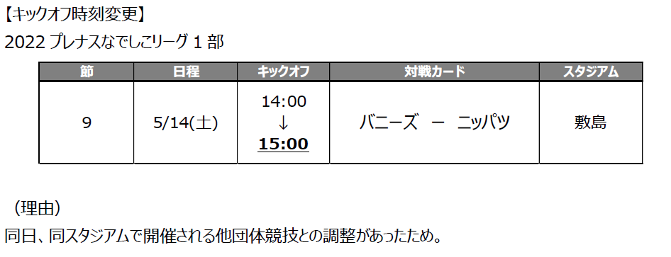 このページを共有する 2022年04月22日 2022プレナスなでしこリーグ1部 キックオフ時刻変更のお知らせ 2022プレナスなでしこリーグ1部の試合において、キックオフ時刻の変更が決定いたしましたので、お知らせいたします。 このページを共有する 前へ 一覧へ 次へ 最新記事2025年12月15日チーム試合レポート:皇后杯準決勝 伊賀FCくノ一三重 vs INAC神戸レオネッサ2025年12月10日リーグ2026シーズンチーム編成および開幕日・大会期間決定のお知らせ2025年12月08日チーム試合レポート:皇后杯準々決勝 伊賀FCくノ一三重 vs 日体大SMG横浜2025年12月08日チーム試合レポート:皇后杯準々決勝 セレッソ大阪ヤンマーレディース vs 朝日インテック・ラブリッジ名古屋2025年12月08日チーム試合レポート:皇后杯準々決勝 サンフレッチェ広島レジーナ vs ASハリマアルビオン2025年11月25日チーム試合レポート:皇后杯3回戦 三菱重工浦和レッズレディース vs 伊賀FCくノ一三重2025年11月25日チーム試合レポート:皇后杯3回戦 AC長野パルセイロ・レディース vs 朝日インテック・ラブリッジ名古屋2025年11月25日チーム試合レポート:皇后杯3回戦 ASハリマアルビオン vs JFAアカデミー福島2025年11月25日チーム試合レポート:皇后杯3回戦 INAC神戸レオネッサ vs 静岡SSUボニータ2025年11月25日チーム試合レポート:皇后杯3回戦 日体大SMG横浜 vs ディオッサ出雲FC