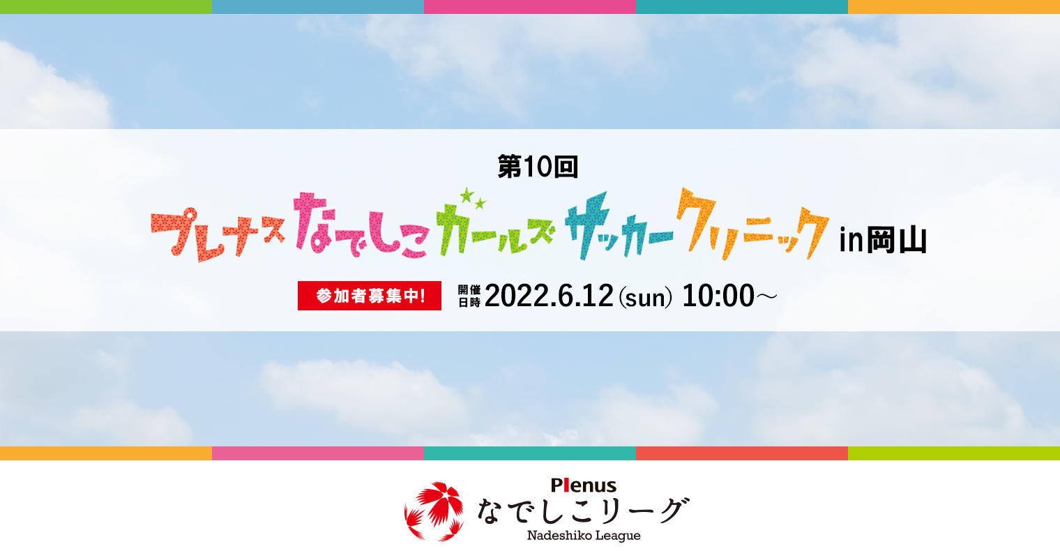 日本女子サッカーリーグは、トップパートナーの株式会社プレナスと、『プレナスなでしこガールズサッカークリニック』を開催いたします。2年ぶりの開催となる第10回目のクリニックは、6月12日(日)、岡山県 / 高梁市神原スポーツ公園多目的グラウンドで開催することを決定いたしました。クリニックは、15歳以下の女子を対象とし、初心者も参加できます。経験豊かな指導者や選手たちと一緒に、基本的なトレーニングを学び、ミニゲームを楽しみながら、スポーツと食の大切さを学ぶ教室となっています。