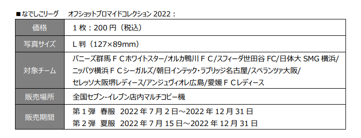 日本女子サッカーリーグは、「素顔の選手紹介企画」において撮影した選手たちのオフショット写真を、「なでしこリーグ オフショットブロマイドコレクション2022」としてセブン-イレブンコンテンツプリントにて7月2日(土)より販売を開始いたしましたので、下記の通りお知らせいたします。