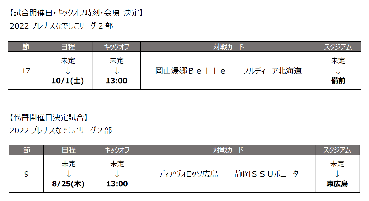 このページを共有する 2022年07月08日 2022プレナスなでしこリーグ2部 日程追加決定・代替開催日決定のお知らせ 2022プレナスなでしこリーグ2部の試合において、第17節岡山湯郷Belle vs ノルディーア北海道の日程の未定分が追加決定、5月22日(日)新型コロナウイルス感染症の影響により中止となりました、第9節ディアヴォロッソ広島 vs 静岡SSUボニータ(12:00キックオフ/三次市みよし運動公園陸上競技場)は8月25日(木) 東広島運動公園陸上競技場に代替開催日が決定いたしましたので、下記の通りお知らせいたします。 このページを共有する 前へ 一覧へ 次へ 最新記事2025年12月10日リーグ2026シーズンチーム編成および開幕日・大会期間決定のお知らせ2025年12月08日チーム試合レポート:皇后杯準々決勝 伊賀FCくノ一三重 vs 日体大SMG横浜2025年12月08日チーム試合レポート:皇后杯準々決勝 セレッソ大阪ヤンマーレディース vs 朝日インテック・ラブリッジ名古屋2025年12月08日チーム試合レポート:皇后杯準々決勝 サンフレッチェ広島レジーナ vs ASハリマアルビオン2025年11月25日チーム試合レポート:皇后杯3回戦 三菱重工浦和レッズレディース vs 伊賀FCくノ一三重2025年11月25日チーム試合レポート:皇后杯3回戦 AC長野パルセイロ・レディース vs 朝日インテック・ラブリッジ名古屋2025年11月25日チーム試合レポート:皇后杯3回戦 ASハリマアルビオン vs JFAアカデミー福島2025年11月25日チーム試合レポート:皇后杯3回戦 INAC神戸レオネッサ vs 静岡SSUボニータ2025年11月25日チーム試合レポート:皇后杯3回戦 日体大SMG横浜 vs ディオッサ出雲FC2025年11月20日チーム試合レポート:皇后杯2回戦 日テレ・東京ヴェルディベレーザ vs ニッパツ横浜FCシーガルズ