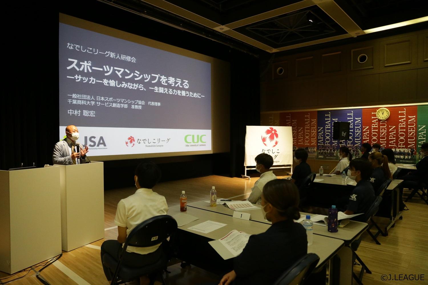 初日は、なでしこリーグ理事長、岩上和道による主催者挨拶の後、一般社団法人日本スポーツマンシップ協会代表理事の中村聡宏氏より「スポーツマンシップ」について講義がありました。良きスポーツマンの姿やスポーツの価値について考える貴重な時間となりました。