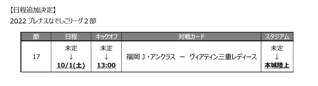 このページを共有する 2022年09月06日 2022プレナスなでしこリーグ2部 日程追加決定のお知らせ 2022プレナスなでしこリーグ2部の試合において、日程の未定分が追加決定いたしましたので、下記の通りお知らせいたします。 このページを共有する 前へ 一覧へ 次へ 最新記事2025年12月10日リーグ2026シーズンチーム編成および開幕日・大会期間決定のお知らせ2025年12月08日チーム試合レポート:皇后杯準々決勝 伊賀FCくノ一三重 vs 日体大SMG横浜2025年12月08日チーム試合レポート:皇后杯準々決勝 セレッソ大阪ヤンマーレディース vs 朝日インテック・ラブリッジ名古屋2025年12月08日チーム試合レポート:皇后杯準々決勝 サンフレッチェ広島レジーナ vs ASハリマアルビオン2025年11月25日チーム試合レポート:皇后杯3回戦 三菱重工浦和レッズレディース vs 伊賀FCくノ一三重2025年11月25日チーム試合レポート:皇后杯3回戦 AC長野パルセイロ・レディース vs 朝日インテック・ラブリッジ名古屋2025年11月25日チーム試合レポート:皇后杯3回戦 ASハリマアルビオン vs JFAアカデミー福島2025年11月25日チーム試合レポート:皇后杯3回戦 INAC神戸レオネッサ vs 静岡SSUボニータ2025年11月25日チーム試合レポート:皇后杯3回戦 日体大SMG横浜 vs ディオッサ出雲FC2025年11月20日チーム試合レポート:皇后杯2回戦 日テレ・東京ヴェルディベレーザ vs ニッパツ横浜FCシーガルズ