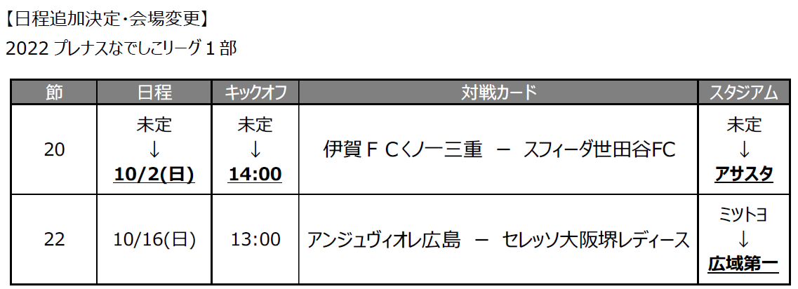 このページを共有する 2022年09月09日 2022プレナスなでしこリーグ1部 日程追加決定・会場変更のお知らせ 2022プレナスなでしこリーグ1部の試合において、日程の未定分が追加決定、会場が変更になりましたので、下記の通りお知らせいたします。 このページを共有する 前へ 一覧へ 次へ 最新記事2025年12月15日チーム試合レポート:皇后杯準決勝 伊賀FCくノ一三重 vs INAC神戸レオネッサ2025年12月10日リーグ2026シーズンチーム編成および開幕日・大会期間決定のお知らせ2025年12月08日チーム試合レポート:皇后杯準々決勝 伊賀FCくノ一三重 vs 日体大SMG横浜2025年12月08日チーム試合レポート:皇后杯準々決勝 セレッソ大阪ヤンマーレディース vs 朝日インテック・ラブリッジ名古屋2025年12月08日チーム試合レポート:皇后杯準々決勝 サンフレッチェ広島レジーナ vs ASハリマアルビオン2025年11月25日チーム試合レポート:皇后杯3回戦 三菱重工浦和レッズレディース vs 伊賀FCくノ一三重2025年11月25日チーム試合レポート:皇后杯3回戦 AC長野パルセイロ・レディース vs 朝日インテック・ラブリッジ名古屋2025年11月25日チーム試合レポート:皇后杯3回戦 ASハリマアルビオン vs JFAアカデミー福島2025年11月25日チーム試合レポート:皇后杯3回戦 INAC神戸レオネッサ vs 静岡SSUボニータ2025年11月25日チーム試合レポート:皇后杯3回戦 日体大SMG横浜 vs ディオッサ出雲FC