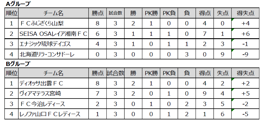 以上の結果により、FCふじざくら山梨、ディオッサ出雲FC、ヴィアマテラス宮崎の3チームが2022プレナスなでしこリーグ2部入替戦(第1節 11/5or11/6、第2節 11/12or11/13、第3節11/20)に進出することが決定いたしました。