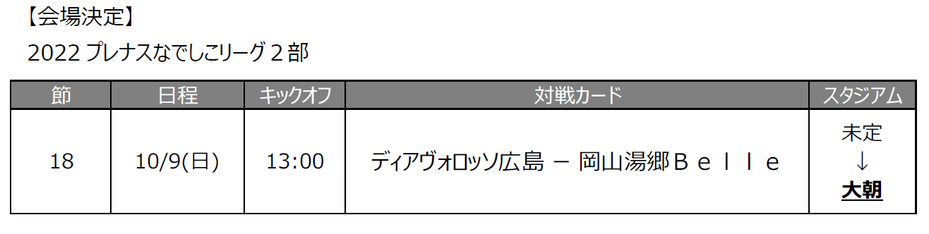 このページを共有する 2022年09月26日 2022プレナスなでしこリーグ2部 会場決定のお知らせ 2022プレナスなでしこリーグ2部の試合において会場の未定分が決定いたしましたので、下記の通りお知らせいたします。 このページを共有する 前へ 一覧へ 次へ 最新記事2025年12月15日チーム試合レポート:皇后杯準決勝 伊賀FCくノ一三重 vs INAC神戸レオネッサ2025年12月10日リーグ2026シーズンチーム編成および開幕日・大会期間決定のお知らせ2025年12月08日チーム試合レポート:皇后杯準々決勝 伊賀FCくノ一三重 vs 日体大SMG横浜2025年12月08日チーム試合レポート:皇后杯準々決勝 セレッソ大阪ヤンマーレディース vs 朝日インテック・ラブリッジ名古屋2025年12月08日チーム試合レポート:皇后杯準々決勝 サンフレッチェ広島レジーナ vs ASハリマアルビオン2025年11月25日チーム試合レポート:皇后杯3回戦 三菱重工浦和レッズレディース vs 伊賀FCくノ一三重2025年11月25日チーム試合レポート:皇后杯3回戦 AC長野パルセイロ・レディース vs 朝日インテック・ラブリッジ名古屋2025年11月25日チーム試合レポート:皇后杯3回戦 ASハリマアルビオン vs JFAアカデミー福島2025年11月25日チーム試合レポート:皇后杯3回戦 INAC神戸レオネッサ vs 静岡SSUボニータ2025年11月25日チーム試合レポート:皇后杯3回戦 日体大SMG横浜 vs ディオッサ出雲FC