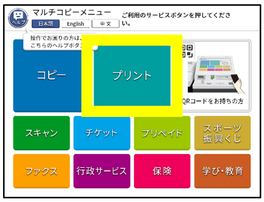 ②セブンーイレブン店内のマルチコピー機のタッチパネルから「プリント」を選択します