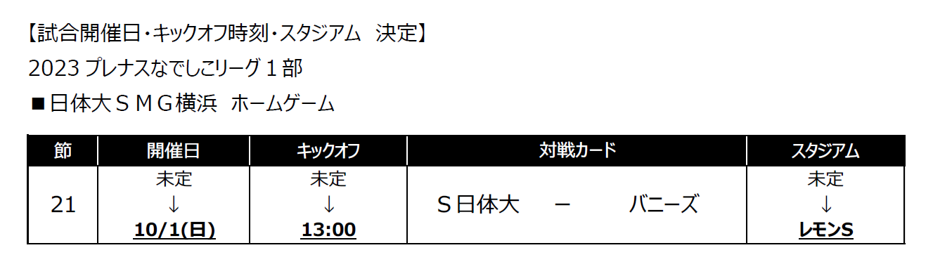 このページを共有する 2023年07月07日 2023 プレナスなでしこリーグ1部 日程・キックオフ時刻・スタジアム追加決定のお知らせ 2023 プレナスなでしこリーグ1部 日程・キックオフ時刻・スタジアムの未定分が追加決定いたしましたので、下記の通りお知らせいたします。 このページを共有する 前へ 一覧へ 次へ 最新記事2025年12月10日リーグ2026シーズンチーム編成および開幕日・大会期間決定のお知らせ2025年12月08日チーム試合レポート:皇后杯準々決勝 伊賀FCくノ一三重 vs 日体大SMG横浜2025年12月08日チーム試合レポート:皇后杯準々決勝 セレッソ大阪ヤンマーレディース vs 朝日インテック・ラブリッジ名古屋2025年12月08日チーム試合レポート:皇后杯準々決勝 サンフレッチェ広島レジーナ vs ASハリマアルビオン2025年11月25日チーム試合レポート:皇后杯3回戦 三菱重工浦和レッズレディース vs 伊賀FCくノ一三重2025年11月25日チーム試合レポート:皇后杯3回戦 AC長野パルセイロ・レディース vs 朝日インテック・ラブリッジ名古屋2025年11月25日チーム試合レポート:皇后杯3回戦 ASハリマアルビオン vs JFAアカデミー福島2025年11月25日チーム試合レポート:皇后杯3回戦 INAC神戸レオネッサ vs 静岡SSUボニータ2025年11月25日チーム試合レポート:皇后杯3回戦 日体大SMG横浜 vs ディオッサ出雲FC2025年11月20日チーム試合レポート:皇后杯2回戦 日テレ・東京ヴェルディベレーザ vs ニッパツ横浜FCシーガルズ