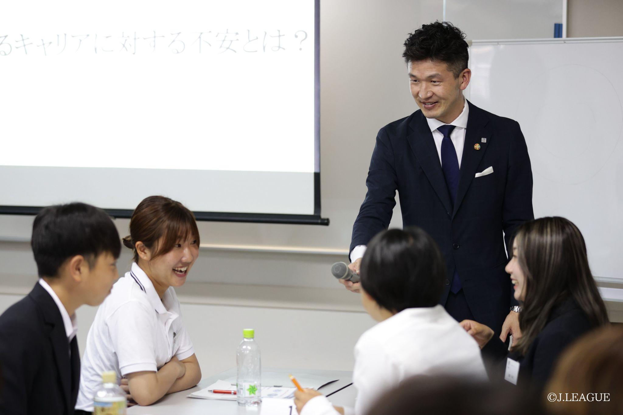 2 コマ目はキャリアデザイン。今年は選手引退後、社会でご活躍されている森田耕一郎氏、海堀あゆみ氏の 2 名にご自身のキャリアや、キャリア選択の際に考えたことをお話いただきました。