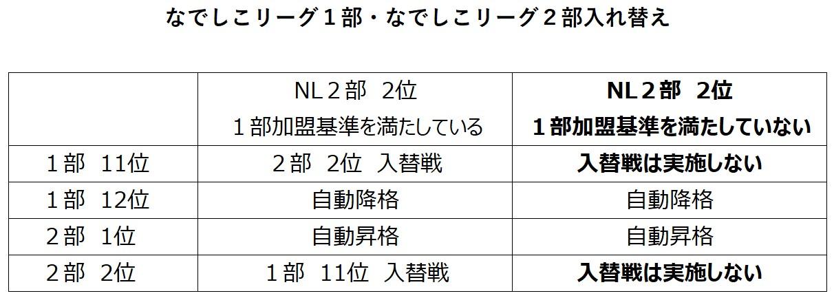 当リーグではJFAアカデミー福島に対し 1 部加盟基準を満たしているか照らし合わせた結果、 JFAアカデミー福島は 1 部加盟基準を満たしていないことが確認できたため、1 部との入れ替えの対象チームとなりませんでした。