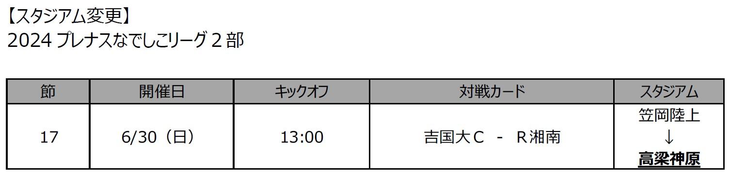 このページを共有する 2024年06月12日 2024プレナスなでしこリーグ2部 スタジアム変更のお知らせ 2024プレナスなでしこリーグ2部の試合においてスタジアムの変更が決定いたしましたので、下記の通りお知らせいたします。 このページを共有する 前へ 一覧へ 次へ 最新記事2025年12月10日リーグ2026シーズンチーム編成および開幕日・大会期間決定のお知らせ2025年12月08日チーム試合レポート:皇后杯準々決勝 伊賀FCくノ一三重 vs 日体大SMG横浜2025年12月08日チーム試合レポート:皇后杯準々決勝 セレッソ大阪ヤンマーレディース vs 朝日インテック・ラブリッジ名古屋2025年12月08日チーム試合レポート:皇后杯準々決勝 サンフレッチェ広島レジーナ vs ASハリマアルビオン2025年11月25日チーム試合レポート:皇后杯3回戦 三菱重工浦和レッズレディース vs 伊賀FCくノ一三重2025年11月25日チーム試合レポート:皇后杯3回戦 AC長野パルセイロ・レディース vs 朝日インテック・ラブリッジ名古屋2025年11月25日チーム試合レポート:皇后杯3回戦 ASハリマアルビオン vs JFAアカデミー福島2025年11月25日チーム試合レポート:皇后杯3回戦 INAC神戸レオネッサ vs 静岡SSUボニータ2025年11月25日チーム試合レポート:皇后杯3回戦 日体大SMG横浜 vs ディオッサ出雲FC2025年11月20日チーム試合レポート:皇后杯2回戦 日テレ・東京ヴェルディベレーザ vs ニッパツ横浜FCシーガルズ