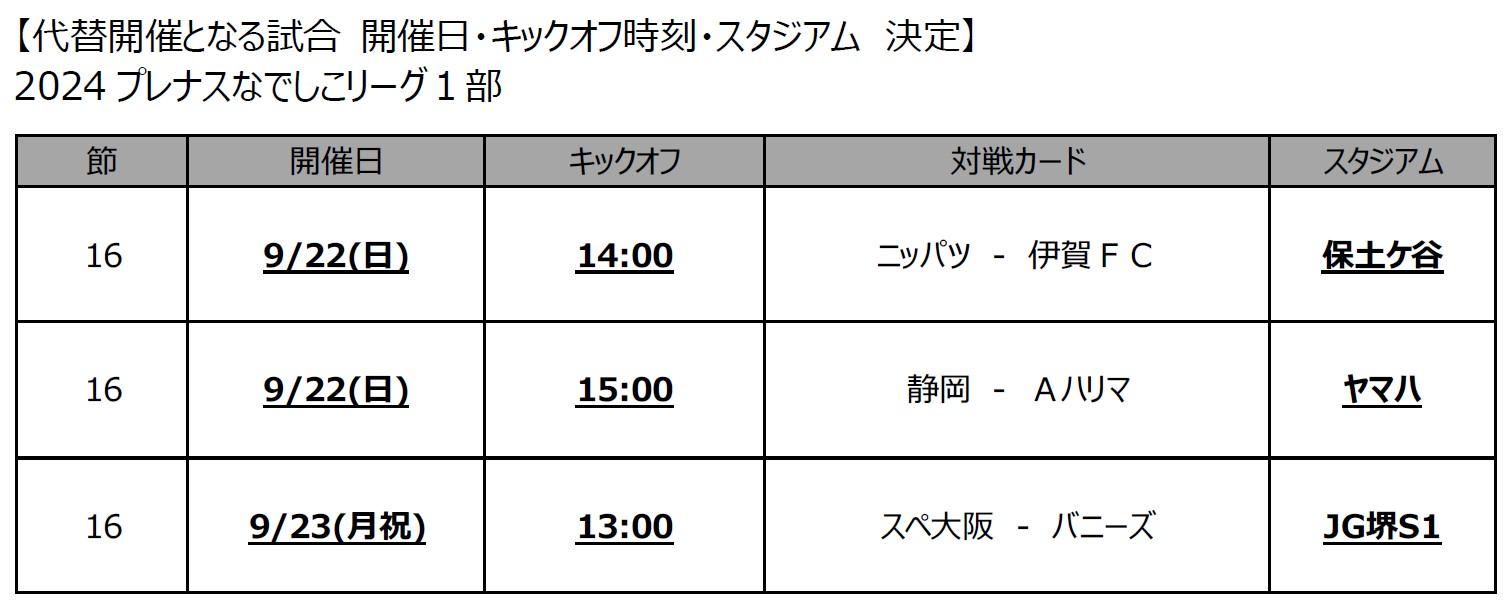 台風10号の影響により開催中止といたしました下記3試合の代替え開催日が決定いたしましたのでお知らせいたします。