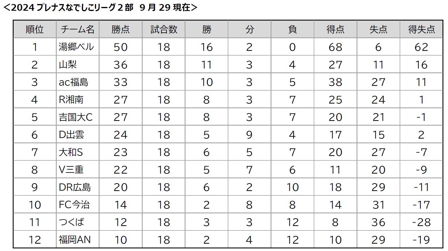 本日9月29日(日)に開催された2024プレナスなでしこリーグ2部 第18節において、岡山湯郷Belleの優勝が決定いたしましたので、お知らせいたします。