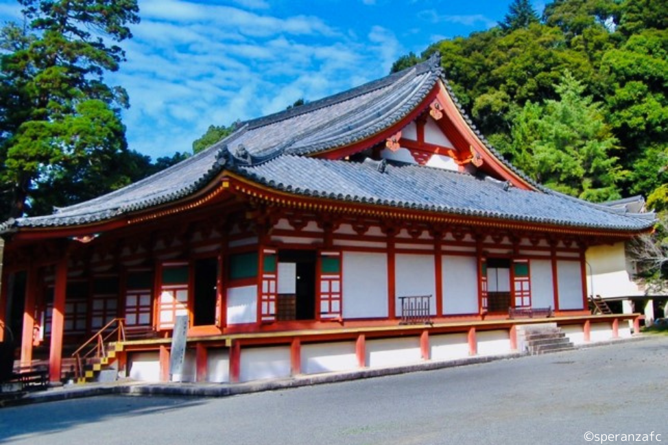 この場所は、今から約700年以上前に遡る南北朝時代の英雄、楠木正成公にゆかりのあるお寺です。本寺院は春の梅や秋の紅葉が特に美しく、季節ごとの異なる景色を楽しむことができます。境内には国宝や重要文化財が多く、歴史的を感じながらパワースポットとしてたくさんの方が訪問されております。歴史と多くの自然に囲まれながらゆったりとしたリラックス時間を過ごすことができる観心寺へ是非足をお運びいただき、またスペランツァ大阪へのご声援をよろしくお願いいたします。