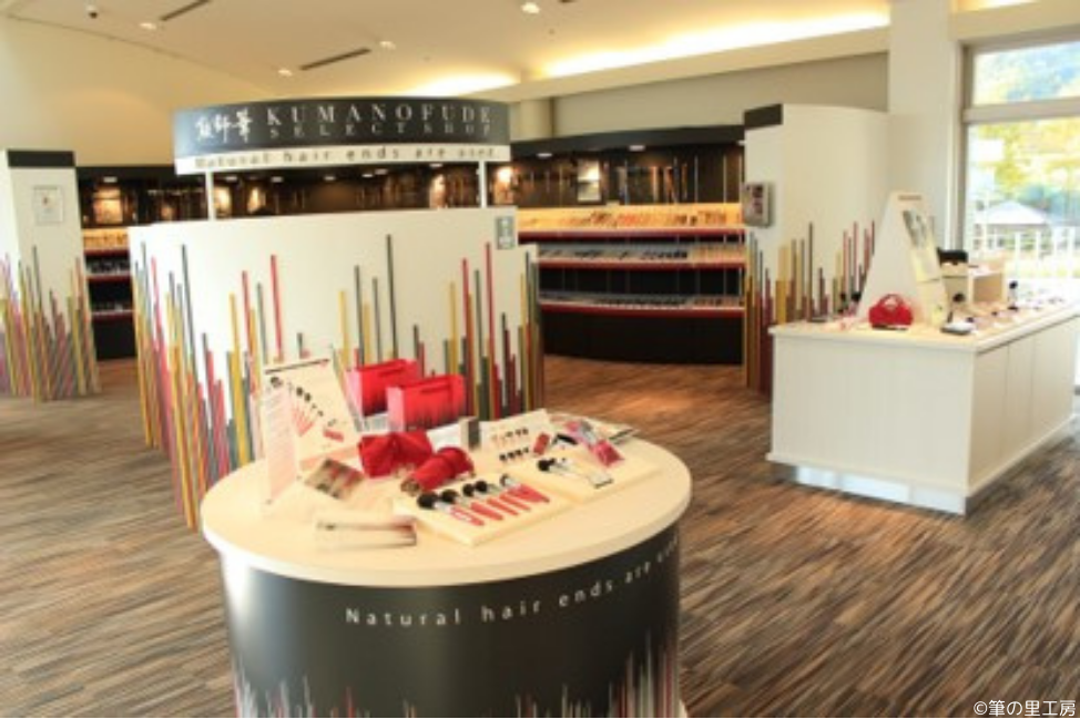 また、館内にあるショップでは、オリジナルグッズのほか、書・画・化粧などの筆を約1500種類取りそろえた熊野筆セレクトショップもあり、試筆しながら選んでいただくことができます。