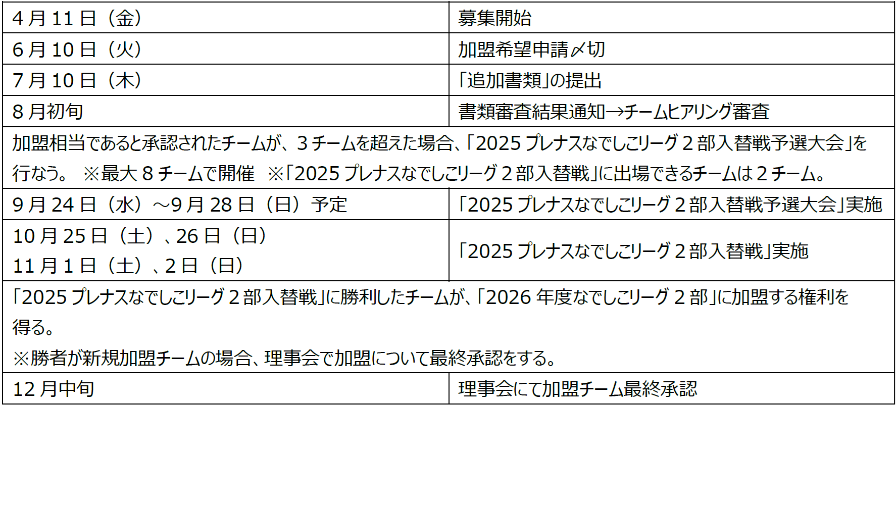 日本女子サッカーリーグは、4月11日(金)より2026年度なでしこリーグ2部加盟希望チームの募集を行いますので、下記の通りお知らせいたします。