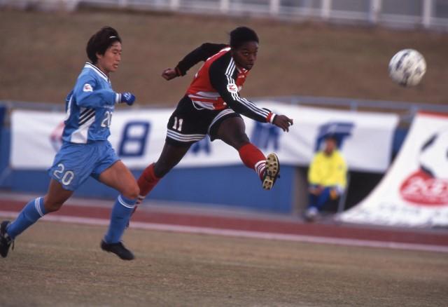 「外国籍選手ラッシュ」は1991年の第3回リーグから始まり、どんどんエスカレートしていきます。1992年には、日興證券がノルウェー代表のFWリンダ・メダレンとDFグン・ニイボルグの加入を発表して大きな話題となります。2人とも前年の女子ワールドカップで準優勝を飾ったノルウェーのレギュラーメンバーで、なかでもメダレンは得点3位、最優秀選手表彰でも3位となった世界的なスターでした。メダレンは最初のシーズンに17ゴールを記録して得点女王となます。そして1994年の第6回リーグでは、「プリマハムFCくノ一」のカナダ代表FWシャーメイン・フーパーが18試合で24ゴールというとてつもない新記録で得点女王となります。