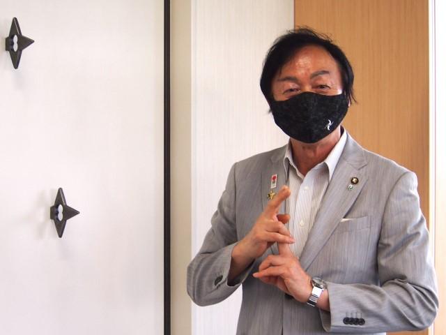 繊細な美しさをもつ伊賀組紐で作ったマスクをつけた伊賀市長 岡本栄さんは、自らも剣道・北辰一刀流、弓道・日置流印西派、水泳・泅水術観海流(しゅうすいじゅつかんかいりゅう)、フェンシング、乗馬を嗜むスポーツマンです。