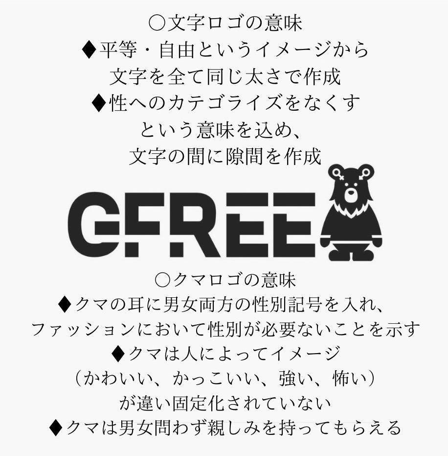 ブランドロゴの隣には、キャラクターの熊がユーモラスに描かれている。熊は、実に様々な表情で描かれる動物でもあり、「GFREE」の多様性のシンボルでもある。