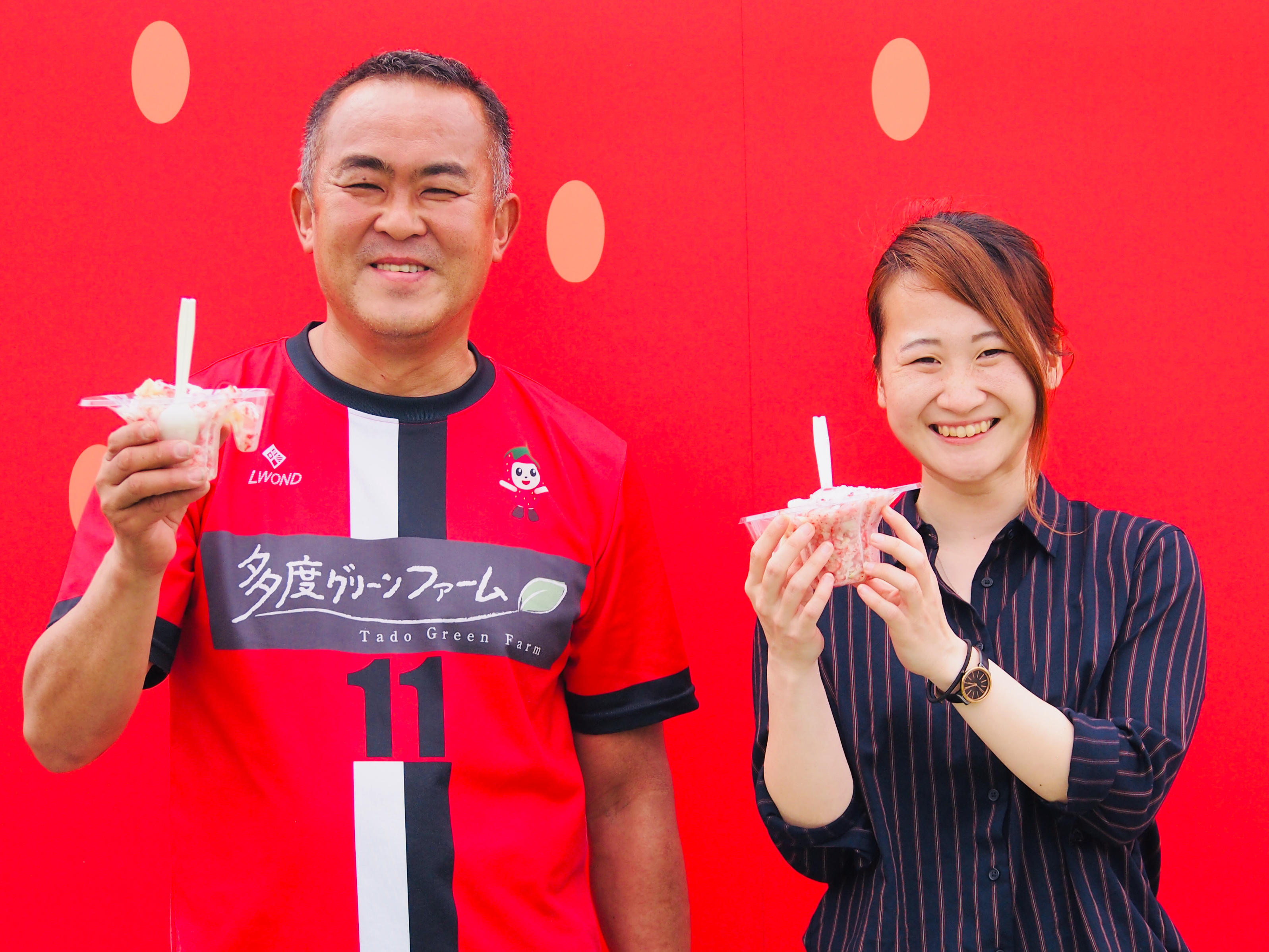 多度グリーンファーム 代表 横井真人さん(左) ヴィアティン三重レディース 福本純子選手(右) (※撮影時にマスクを取りました。)