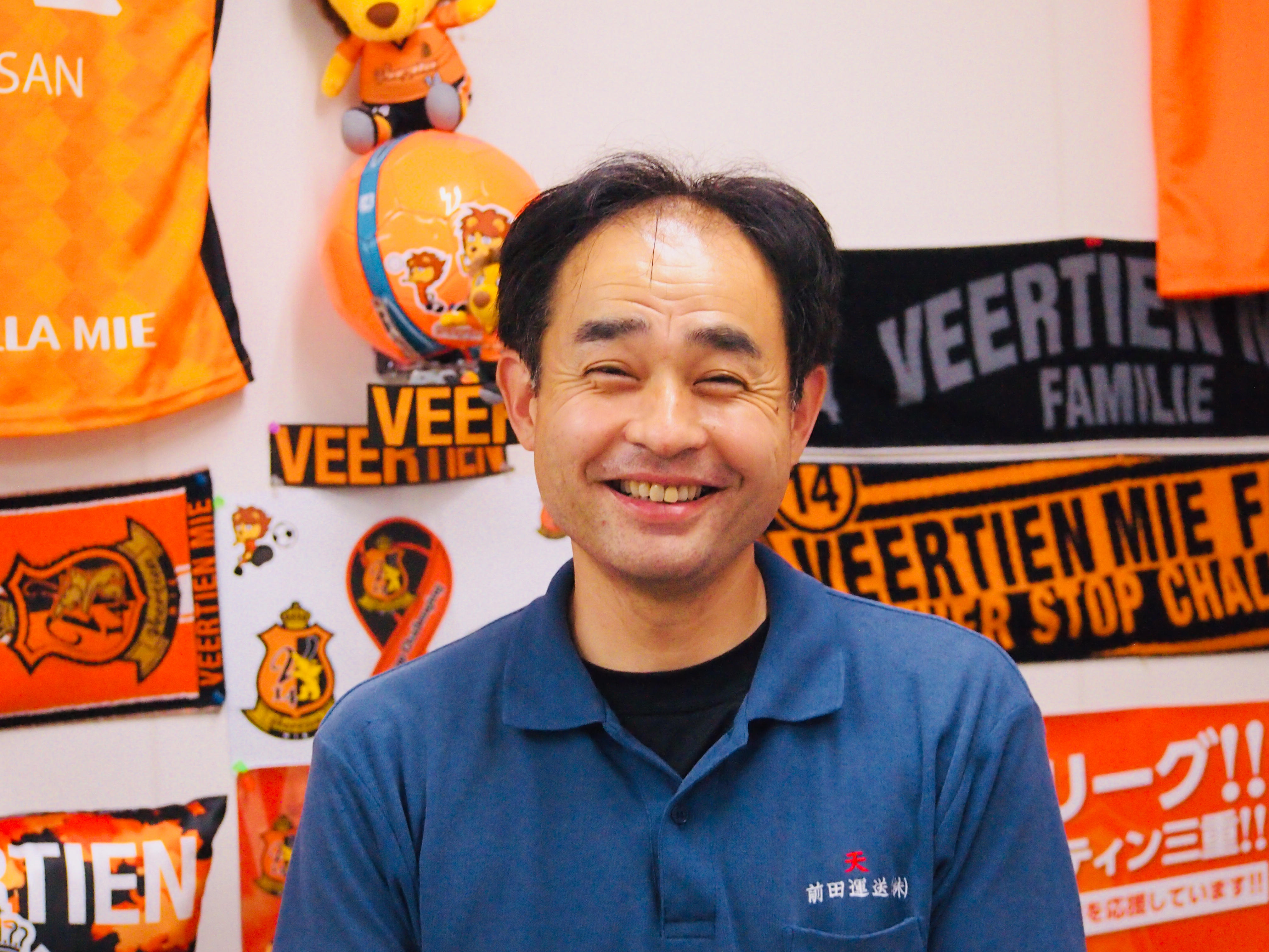 三重県北部は今でも交通の要所です。川を渡れば愛知県、伊勢湾岸道みえ川越インター近くに、前田運送株式会社は4拠点6棟の冷凍冷蔵倉庫を構えています。たくさんのトラックが並ぶ駐車場には100本以上のヴィアティン三重ののぼりが風にはためいています。クラブのエンブレムとマスコットを表現したラッピング大型トラック「ヴィアティン号」も、ここを起点に走ります。最初にお話してくださったのは、前田運送株式会社 倉庫事業部 部長 小山賢司さんです。