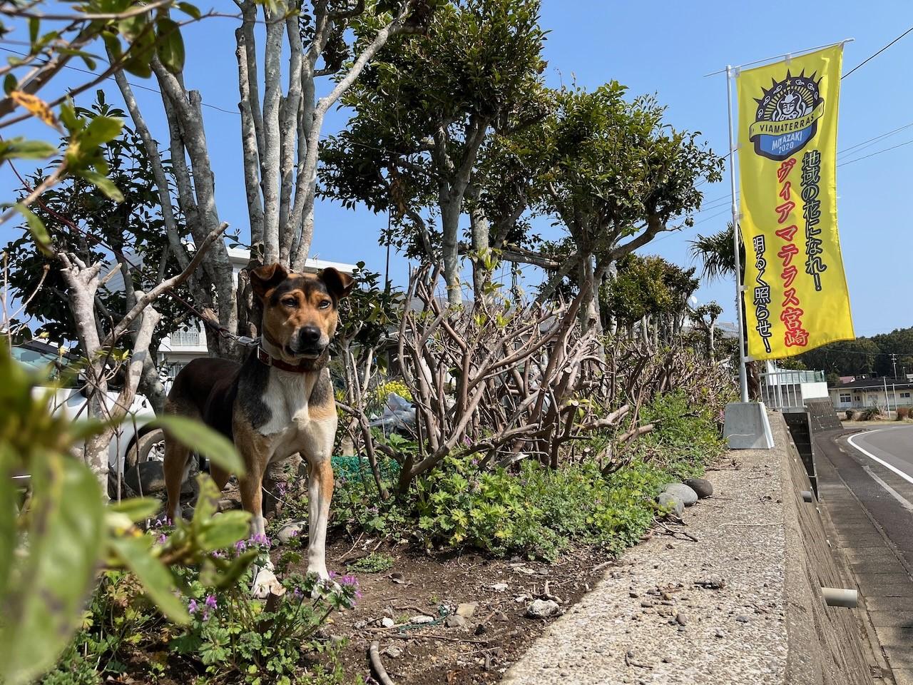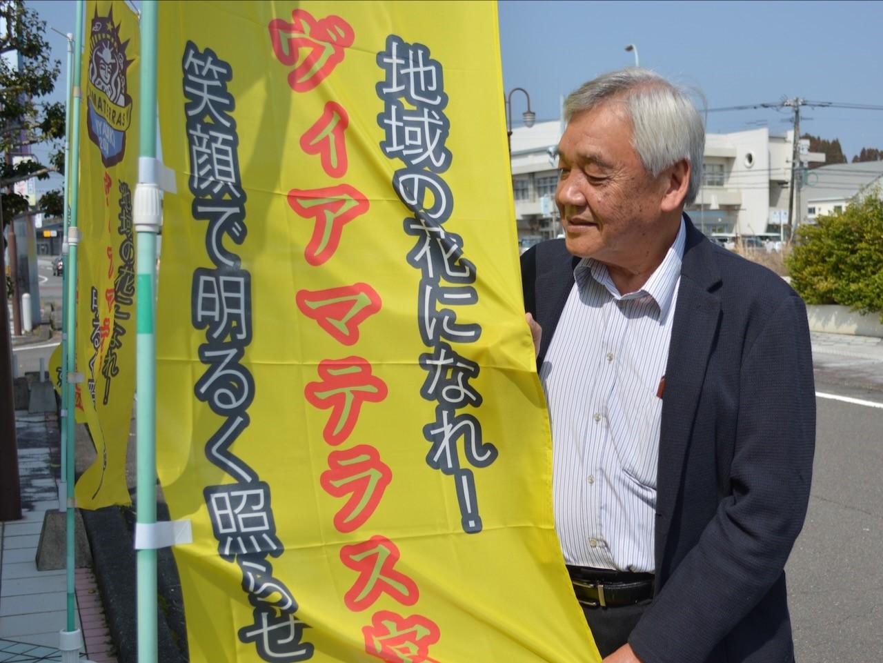 試合の前日は、富田浜公園に向かう道にのぼりを並べるのが高垣さんの日課となっています。そののぼりも自ら200本を製作しました。「地域の花となれ!ヴィアマテラス宮崎 笑顔で明るく照らせ!」と染め抜かれた黄色いのぼりは、海風を受けて元気よくはためいています。