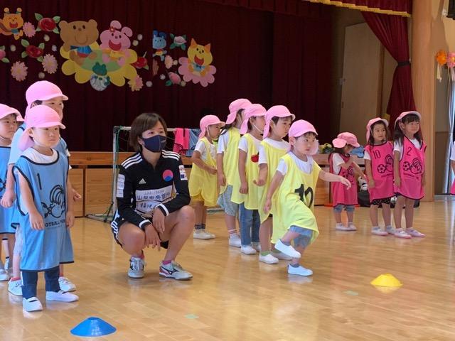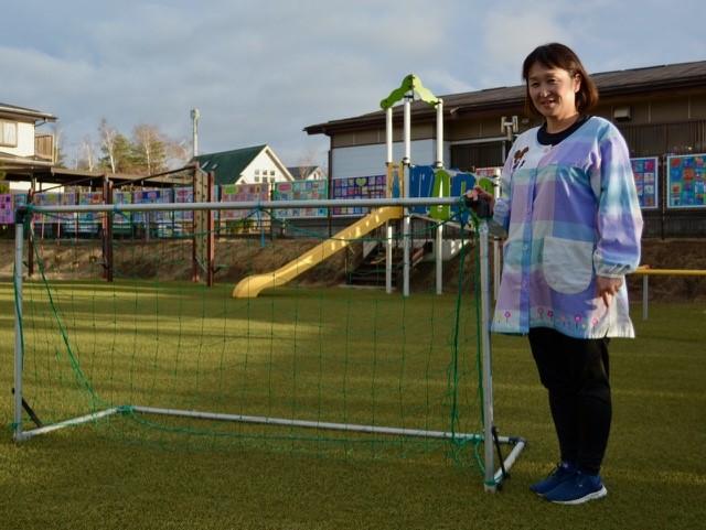 人工芝の緑が鮮やかな船津保育所の園庭にはミニサッカーのゴールが置いてありす。「ボールを蹴る子が多いですよ」と中村さんが笑います。船津保育所ではFCふじざくら山梨の選手によるサッカー教室が行われています。中村さんの発案から始まりました。サッカーの話をするときの中村さんは楽しそうです。