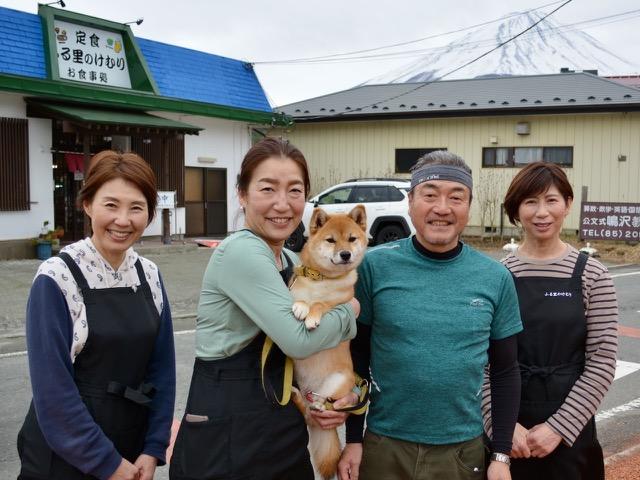 川上陽子さん・泰司さん(中央)、広報担当看板犬・お里 流石輝美さん(左)、小佐野敬子さん(右)