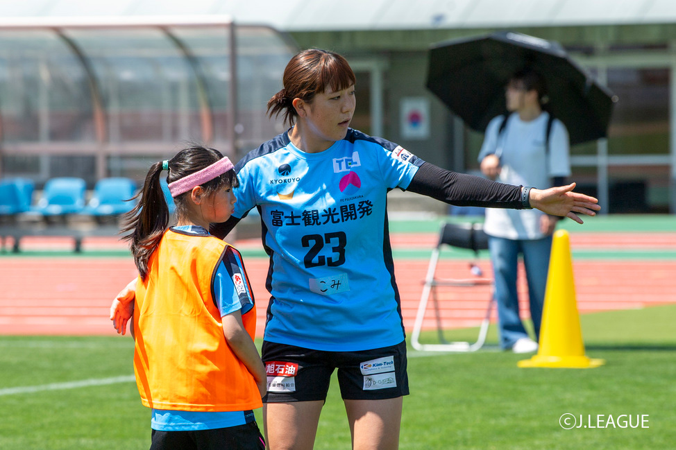 山梨県サッカー協会の清水たけみコーチのサポートを受けながら、FCふじざくら山梨の坂田コーチ、小尾コーチ、篠田コーチと須田 胡桃選手、高山 紗希選手、広沢 実佳子選手、大森 みさき選手、保坂 のどか選手が参加。晴天の中、笑顔でサッカーを楽しみました。