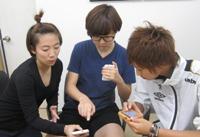 2人とも人懐こく、すでにチームに溶け込んでいますが、日本語はまだまだ。チームメイトとは片言の英語と、練習の前後はこうして(写真)、スマホの翻訳アプリでコミュニケーションをとっています(写真右端は亀岡夏美選手)。