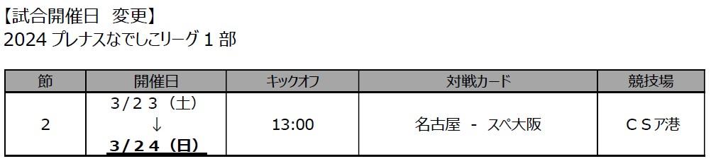 このページを共有する 2024年02月15日 2024プレナスなでしこリーグ1部 開催日変更のお知らせ 2024プレナスなでしこリーグ1部の日程の試合開催日に変更がありましたので、下記の通りお知らせいたします。 このページを共有する 前へ 一覧へ 次へ 最新記事2025年12月10日リーグ2026シーズンチーム編成および開幕日・大会期間決定のお知らせ2025年12月08日チーム試合レポート:皇后杯準々決勝 伊賀FCくノ一三重 vs 日体大SMG横浜2025年12月08日チーム試合レポート:皇后杯準々決勝 セレッソ大阪ヤンマーレディース vs 朝日インテック・ラブリッジ名古屋2025年12月08日チーム試合レポート:皇后杯準々決勝 サンフレッチェ広島レジーナ vs ASハリマアルビオン2025年11月25日チーム試合レポート:皇后杯3回戦 三菱重工浦和レッズレディース vs 伊賀FCくノ一三重2025年11月25日チーム試合レポート:皇后杯3回戦 AC長野パルセイロ・レディース vs 朝日インテック・ラブリッジ名古屋2025年11月25日チーム試合レポート:皇后杯3回戦 ASハリマアルビオン vs JFAアカデミー福島2025年11月25日チーム試合レポート:皇后杯3回戦 INAC神戸レオネッサ vs 静岡SSUボニータ2025年11月25日チーム試合レポート:皇后杯3回戦 日体大SMG横浜 vs ディオッサ出雲FC2025年11月20日チーム試合レポート:皇后杯2回戦 日テレ・東京ヴェルディベレーザ vs ニッパツ横浜FCシーガルズ
