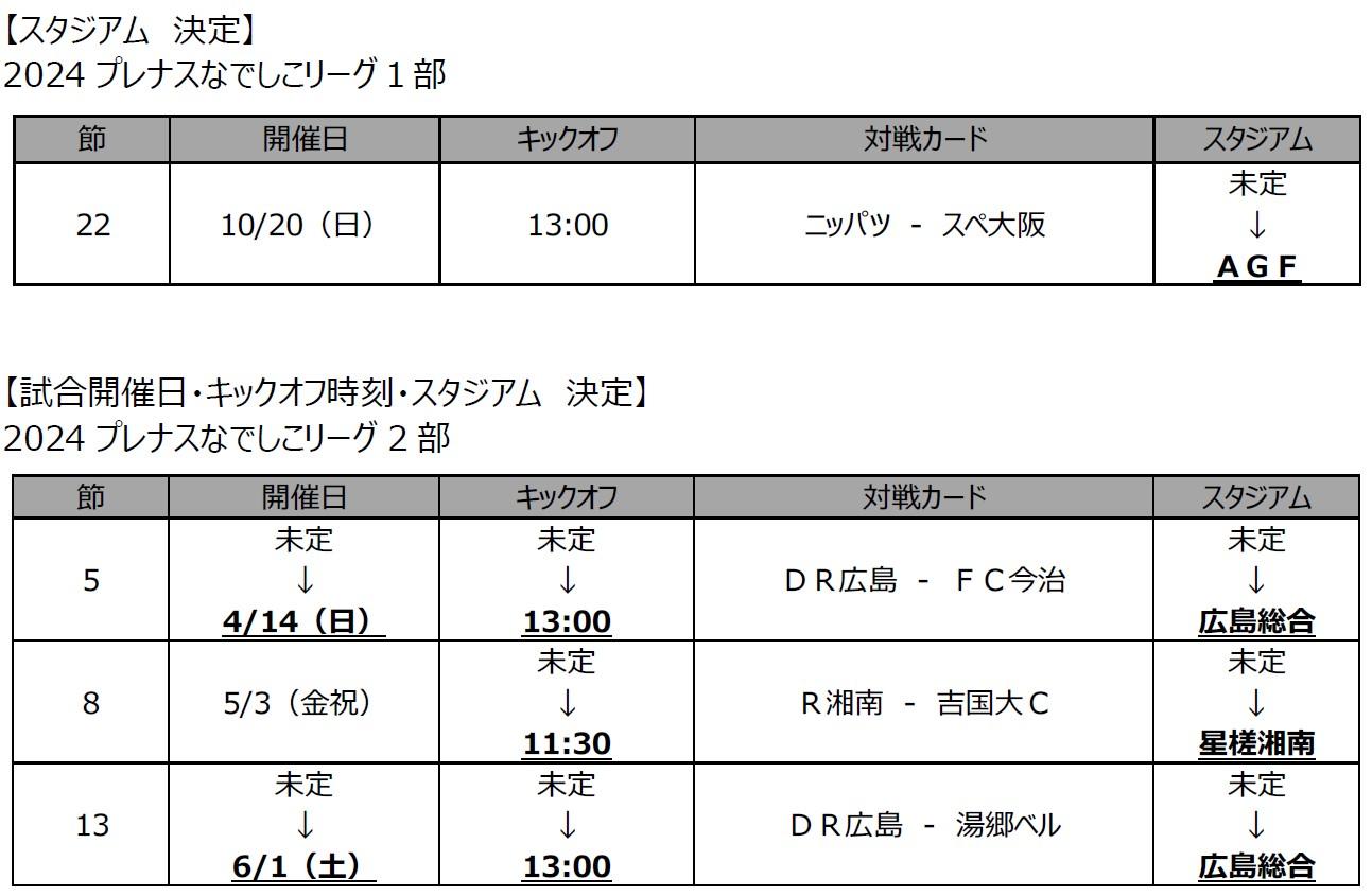 このページを共有する 2024年03月01日 2024 プレナスなでしこリーグ1 部/2024 プレナスなでしこリーグ2部 日程追加決定のお知らせ 2024 プレナスなでしこリーグ1 部、2024 プレナスなでしこリーグ2部の日程の未定分が追加決定いたしましたので、下記の通りお知らせいたします。 このページを共有する 前へ 一覧へ 次へ 最新記事2025年12月10日リーグ2026シーズンチーム編成および開幕日・大会期間決定のお知らせ2025年12月08日チーム試合レポート:皇后杯準々決勝 伊賀FCくノ一三重 vs 日体大SMG横浜2025年12月08日チーム試合レポート:皇后杯準々決勝 セレッソ大阪ヤンマーレディース vs 朝日インテック・ラブリッジ名古屋2025年12月08日チーム試合レポート:皇后杯準々決勝 サンフレッチェ広島レジーナ vs ASハリマアルビオン2025年11月25日チーム試合レポート:皇后杯3回戦 三菱重工浦和レッズレディース vs 伊賀FCくノ一三重2025年11月25日チーム試合レポート:皇后杯3回戦 AC長野パルセイロ・レディース vs 朝日インテック・ラブリッジ名古屋2025年11月25日チーム試合レポート:皇后杯3回戦 ASハリマアルビオン vs JFAアカデミー福島2025年11月25日チーム試合レポート:皇后杯3回戦 INAC神戸レオネッサ vs 静岡SSUボニータ2025年11月25日チーム試合レポート:皇后杯3回戦 日体大SMG横浜 vs ディオッサ出雲FC2025年11月20日チーム試合レポート:皇后杯2回戦 日テレ・東京ヴェルディベレーザ vs ニッパツ横浜FCシーガルズ