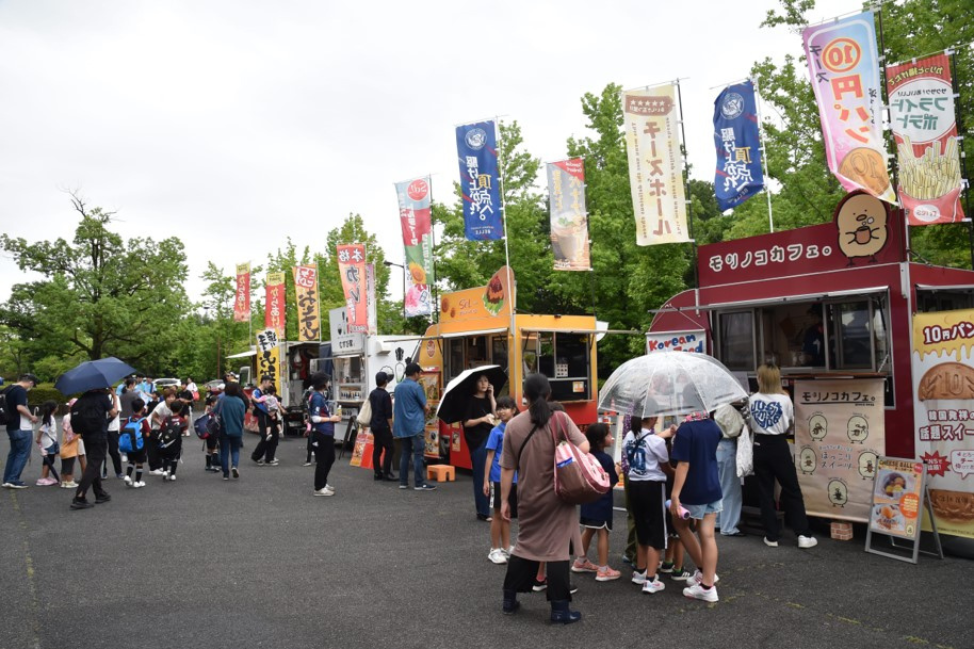毎試合10店舗近くのグルメが出店しています!焼きそばをはじめ、おむすび、ドリンクのほかに、なぎビーフの串焼きなど地元のグルメも多数出店!