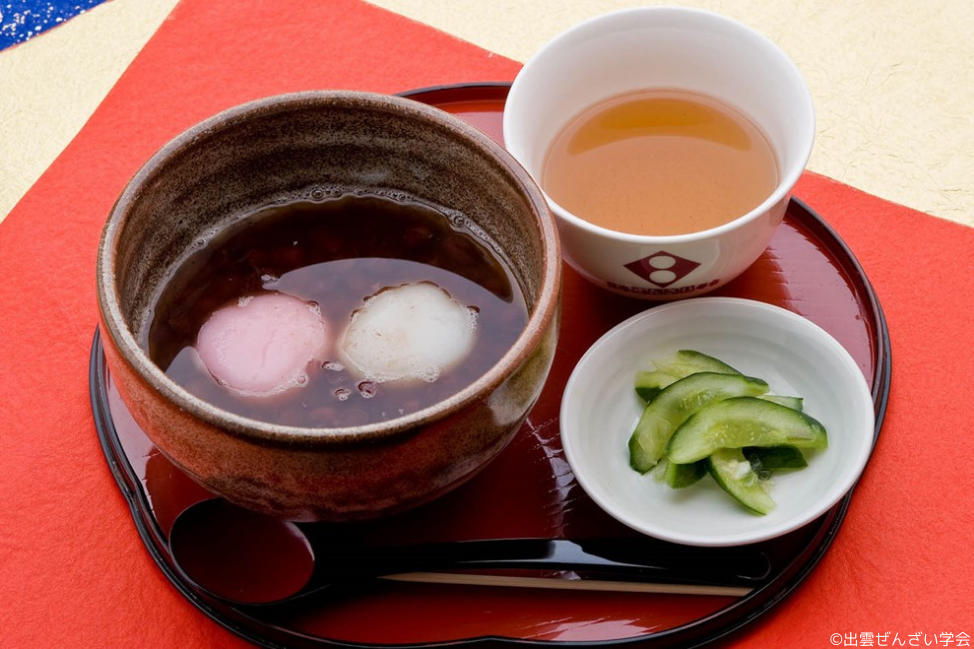 「ぜんざい」は、諸説ありますが、出雲の「じんざい餅」に起源があるとされていて、出雲は、ぜんざい発祥の地とされています。出雲では、正月1日には、しょうゆベースの雑煮を、2日にはぜんざいをして食べる風習があり、地元の人にはなじみのある食べ物であります。