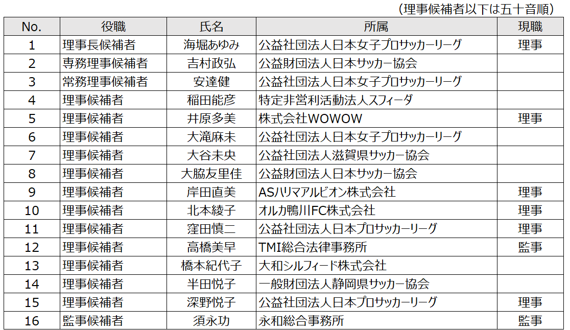 日本女子サッカーリーグは、本日2025年度第2回理事会を開催し、役員候補者選考委員会が答申した次期理事長候補を含む下記役員候補者を承認しました。なお、下記候補者は4 月21日(月)開催予定の定時社員総会の決議において選任され、ならびに同日の理事会での決議をもって正式に役職が決定します。